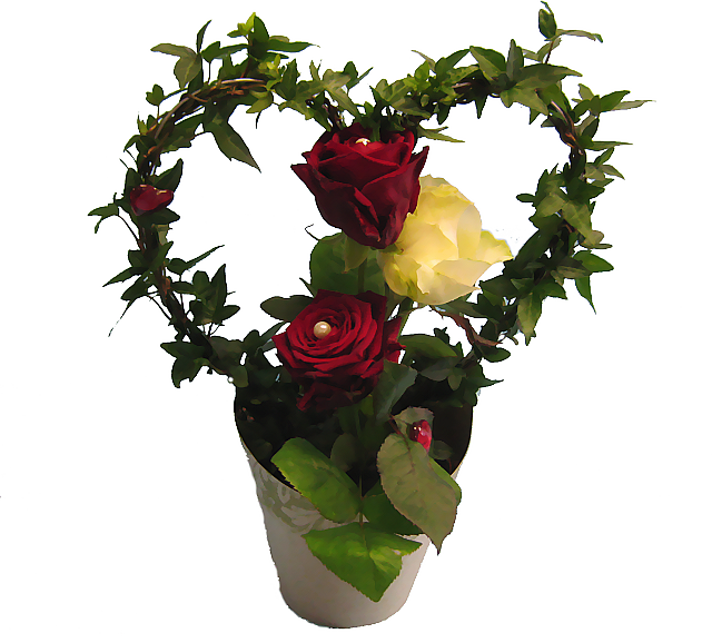Eine herzförmige Efeupflanze wird mit Rosen verziert. Kleine Wasseröhrchen versorgen die Rosen mit Flüssigkeit.