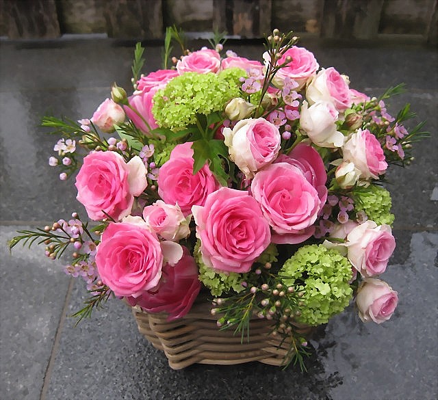 Trendige rose und grüne Farbtöne werden mit Beiwerk in einem geflochtenen Korb gearbeitet.