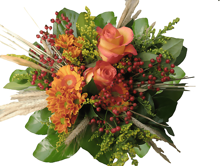 Blüten in warmen Herbstfarben werden mit Getreidezweigen zu einem stimmungsvollen Blumengruss gestaltet.