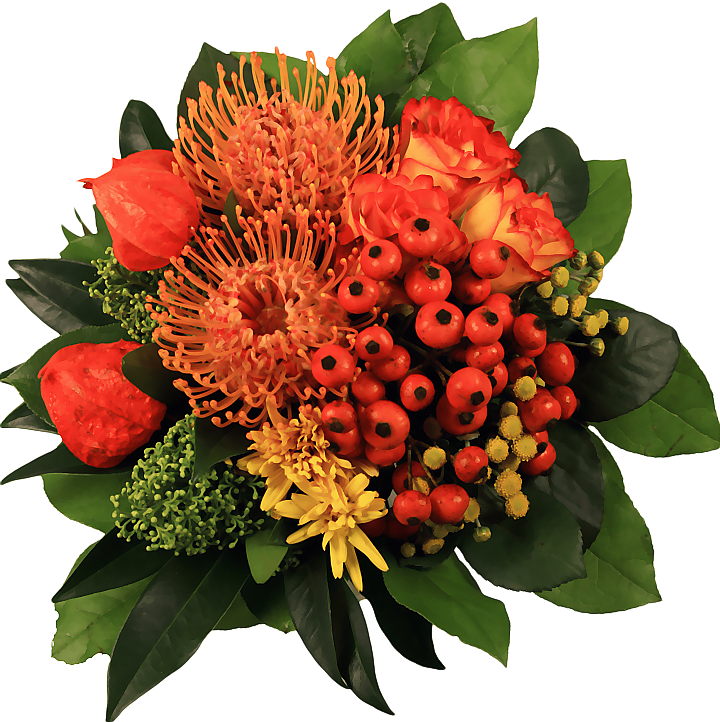 Kompakt gebundener Strauß aus kräftigen Herbstfarben mit Proteablüten aus Südafrika, Blumen und Beiwerk der Saison.
