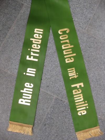 Grüne Kranz, Grabgesteck u.-Schalenschleife: Diese Schleifen sind passend für alle Trauerkränze, Buketts, Grabsträuße und Pflanzschalen. Als Beispiele für den ersten Flügel: In Liebe, In Anteilnahme, Letzter Gruß, In stillem Gedenken, In lieber Erinnerung ... Auf dem zweiten Flügel sollten die Namen stehen, wie zum Beispiel: Die Nachbarn usw.... Sollten Sie Fragen haben? Telefon 089/400182