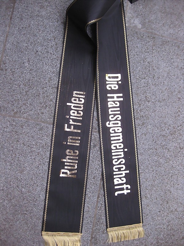Schwarze Kranz, Grabgesteck u.-Schalenschleife: Diese Schleifen sind passend für alle Trauerkränze, Buketts, Grabsträuße und Pflanzschalen. Als Beispiele für den ersten Flügel: In Liebe, In Anteilnahme, Letzter Gruß, In stillem Gedenken, In lieber Erinnerung ... Auf dem zweiten Flügel sollten die Namen stehen, wie zum Beispiel: Die Nachbarn usw.... Sollten Sie Fragen haben? Telefon 089/400182