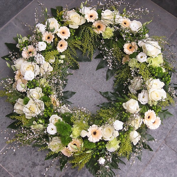 Blütenkranz: Die Blüten werden gruppiert mit aparten Grün-Sorten in einer runden Kranzform arrangiert.