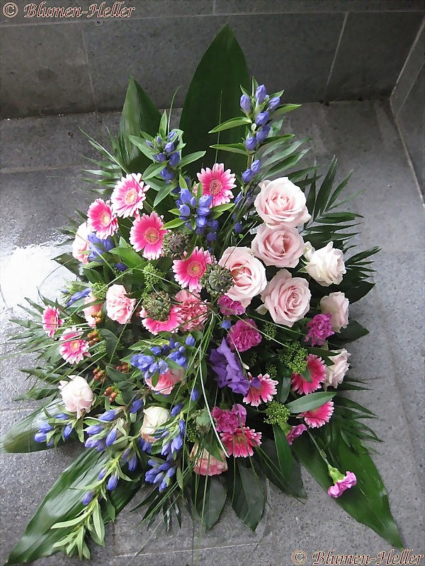 Bukett: Farblich abgestimmte Blumen werden in eine Steckvorrichtung gestuft nach hinten höher gearbeitet. Trauerschleifen für einen persönlichen Abschiedsgruß finden Sie auf der rechten Menüleiste.