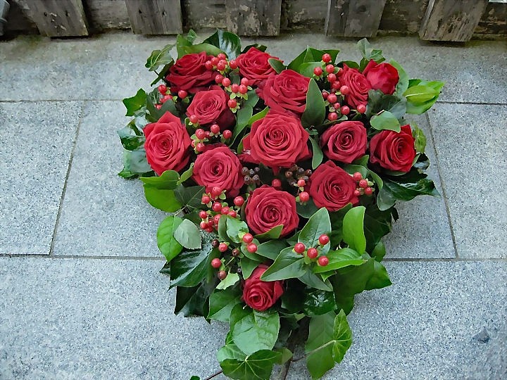 Rosenherz: In eine herzförmige Unterlage werden aufgelockert mit saisonalen Beiwerk die Rosenblüten gearbeitet. Trauerschleifen für einen persönlichen Abschiedsgruß finden Sie auf der rechten Menüleiste. Da wir jeden Blumenschmuck individuell für Sie anfertigen, kann es zu natürlichen Farbspielen und Abweichungen der Blumenauswahl kommen.Selbstverständlich bemühen wir uns Ihre Bestellung so genau wie möglich auszuführen. Lieferzeit: ca.1Werktag, in dringenden Fällen auch noch am gleichen Tag. Sollten Sie Fragen haben? Telefon 089/400182