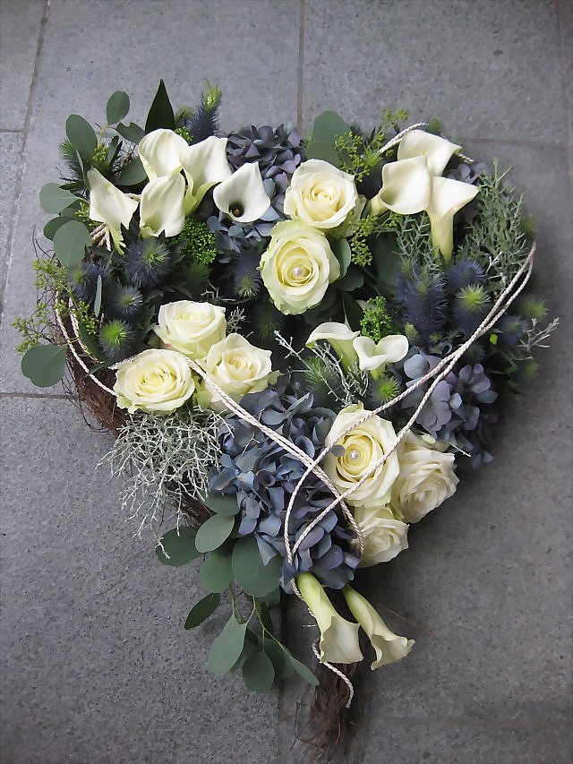Strukturherz: In eine herzförmige Unterlage werden ganz dicht, und gruppiert Blüten arrangiert.