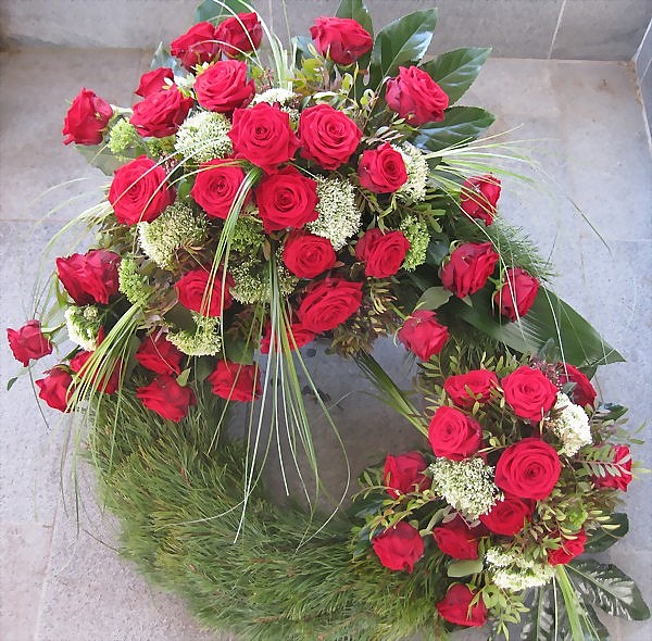 Trauerkranz modern Style: Farblich abgestimmte Blumen, werden gruppiert und asymetrisch mit dekorativen Grünmaterialien kombiniert. Trauerschleifen für einen persönlichen Abschiedsgruß finden Sie auh auf der rechten Menüleiste. Abbildung zeigt in etwa die Premium-Variante. Da wir jeden Blumenschmuck individuell für Sie anfertigen, kann es zu natürlichen Farbspielen und Abweichungen der Blumenauswahl kommen.Selbstverständlich bemühen wir uns Ihre Bestellung so genau wie möglich auszuführen. Lieferzeit: ca.1Werktag, in dringenden Fällen auch noch am gleichen Tag. Sollten Sie Fragen haben? Telefon 089/400182
