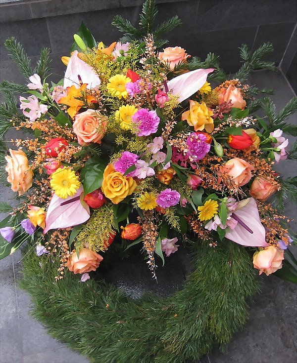 Trauerkranz Kopfgarnierung: Die Blüten werden aufgelockert im oberen Drittel des Kranzes arrangiert.