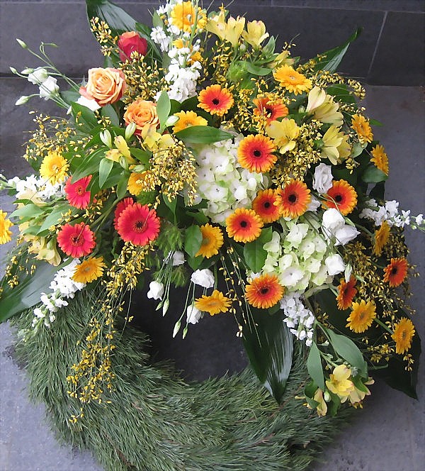 Trauerkranz Kopfgarnierung: Die Blüten werden aufgelockert im oberen Drittel des Kranzes arrangiert. Trauerschleifen für einen persönlichen Abschiedsgruß finden Sie auf der rechten Menüleiste. Abbildung zeigt in etwa die Premium-Variante. Da wir jeden Blumenschmuck individuell für Sie anfertigen, kann es zu natürlichen Farbspielen und Abweichungen der Blumenauswahl kommen.Selbstverständlich bemühen wir uns Ihre Bestellung so genau wie möglich auszuführen. Lieferzeit: ca.1Werktag, in dringenden Fällen auch noch am gleichen Tag. Sollten Sie Fragen haben? Telefon 089/400182